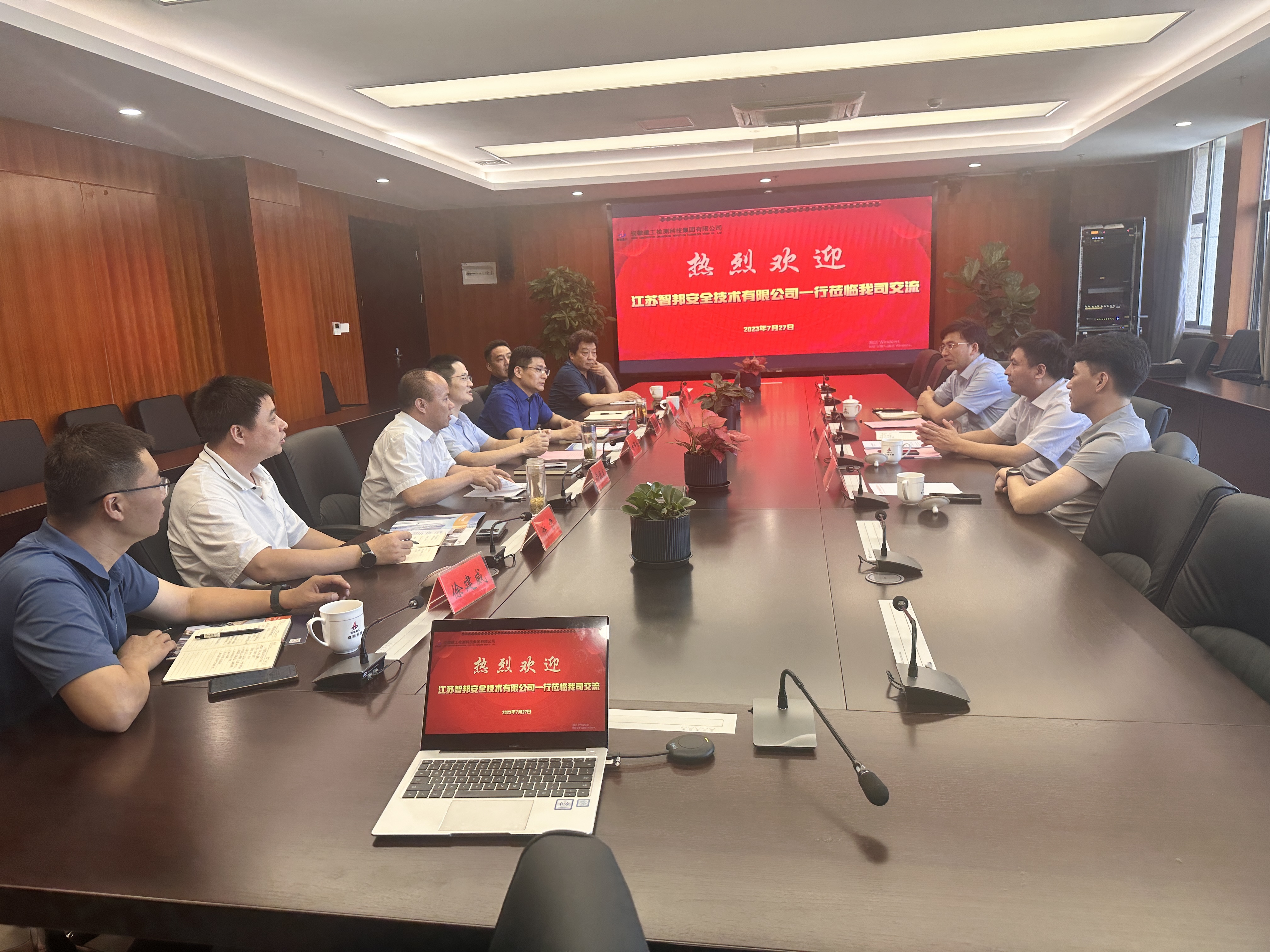 7月27日下午,江蘇智邦安全技術有限公司董事長王鐵鎖一行來我公司交流調研,建工檢測黨委書記、董事長方申柱在檢測大廈19樓熱情接待來訪客人。