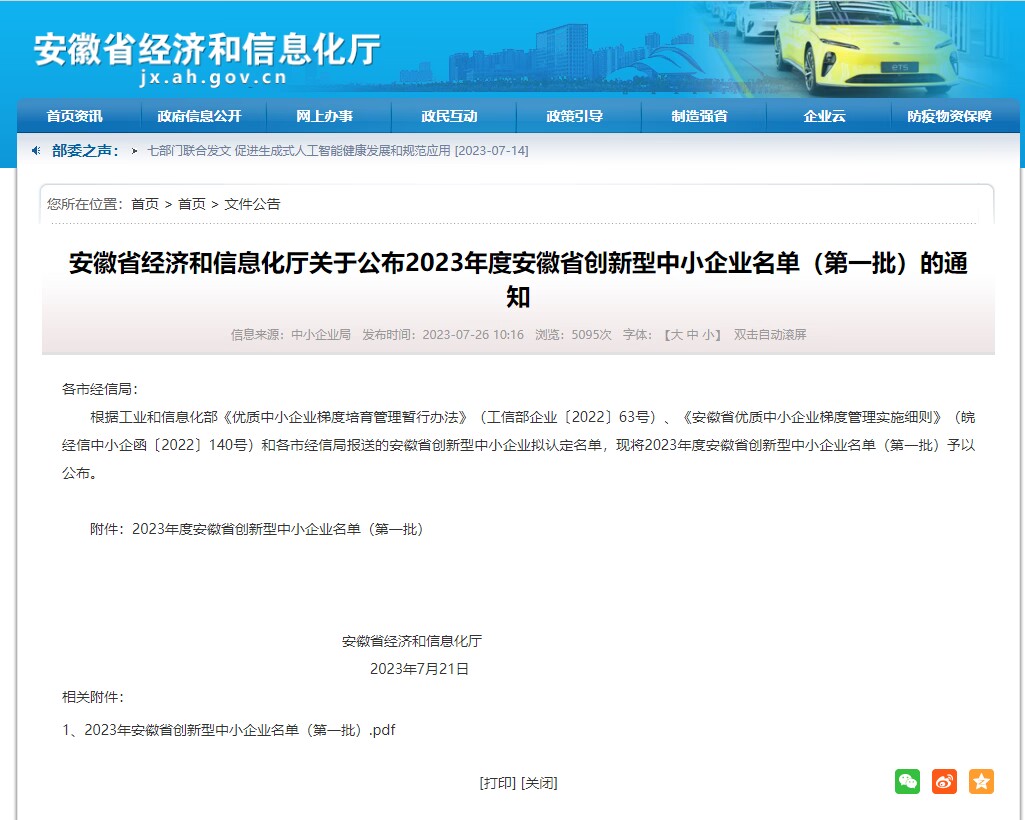 近日,安徽省經濟與信息化廳公布了2023年度安徽省創新型中小企業名單(第一批),安徽環通工程試驗檢測有限公司榜上有名。