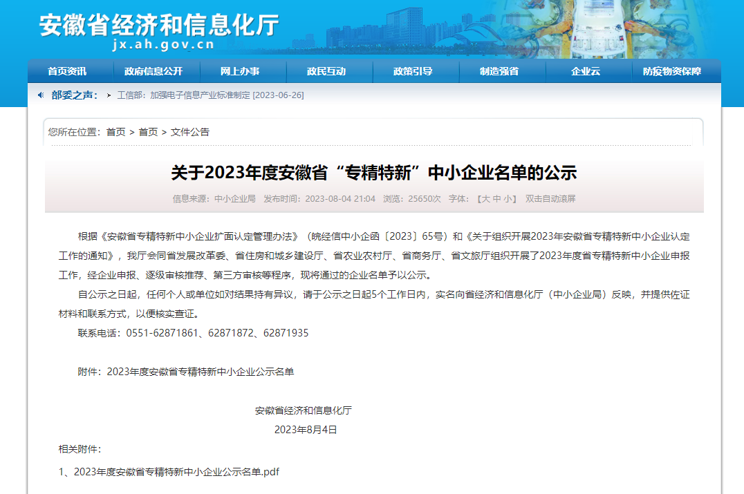 喜報!環通公司成功上榜2023年度安徽省 “專精特新”中小企業名單