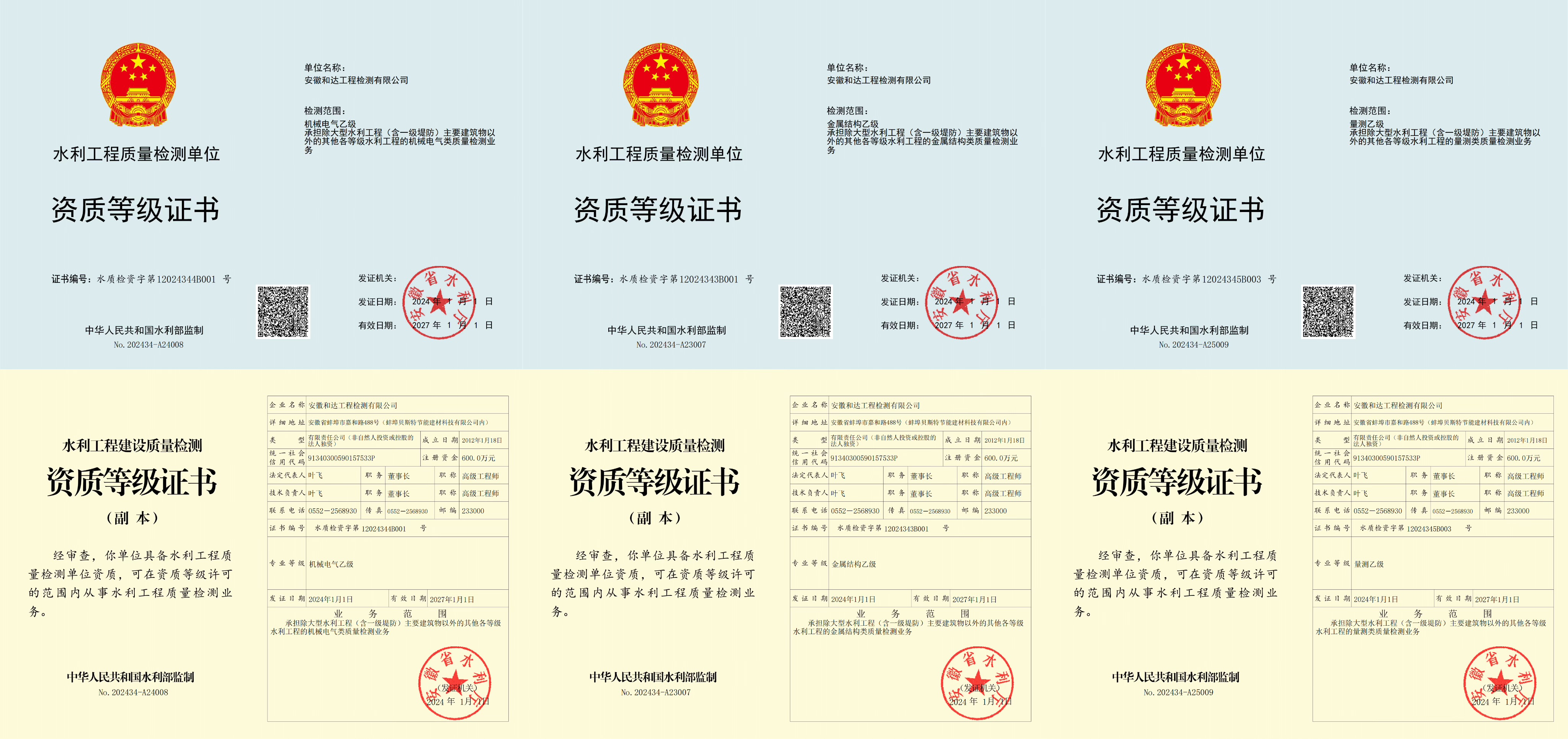 喜報丨新年第一份禮物——和達檢測取得水利工程“金屬結構、機械電氣乙級證書和量測乙級換證復核證書”