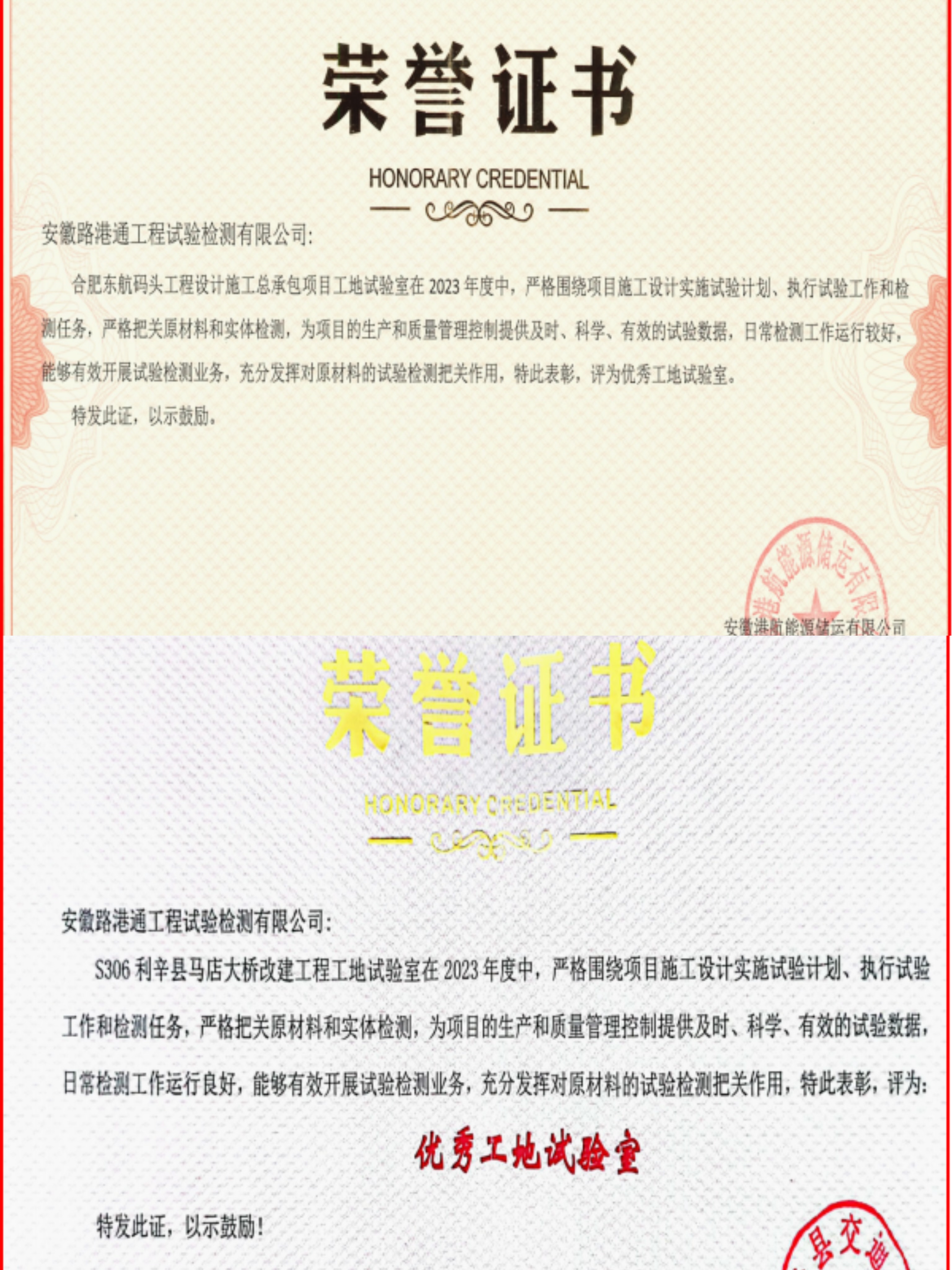 近日,建工檢測路港通公司多個工地試驗室在業主單位年度考核中獲得“優秀工地試驗室”表彰。這些榮譽標志著我公司工地試驗室檢測服務得到了業主方的認可,并進一步鞏固了路港通在工地試驗室管理方面的品牌地位。