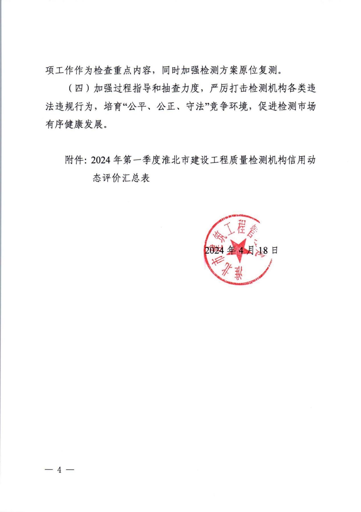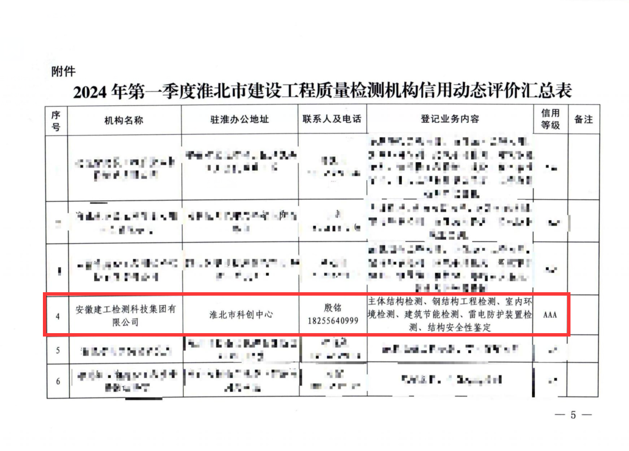 4月18日,淮北市住建局建設工程管理處公布了淮北市建設工程質量檢測機構第一季度監督檢查結果,安徽建工檢測科技集團獲得“AAA”級(最高等級)信用評價,這說明建工檢測在淮北的技術力量和檢測成績得到了主管部門高度的肯定和認可。