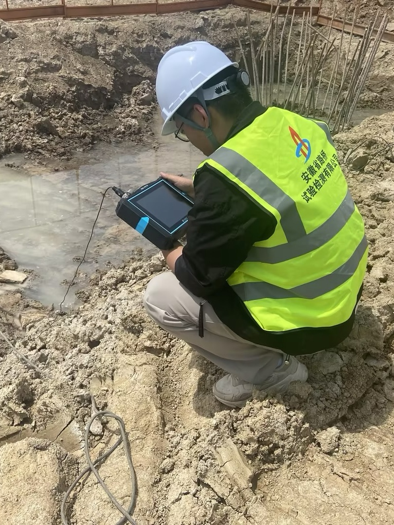 萬海超,路橋檢測結構檢測研究所助理檢測師,榮獲2023年度建工檢測“優秀共青團員”稱號,正在使用基樁低應變檢測儀進行樁頂施加低能量沖擊荷載試驗,實測被檢樁加速度(或速度)響應時程曲線,運用一維線彈性波動理論的時域和頻域分析,對被檢樁的樁身完整性進行評判,其目的是檢測樁身缺陷及位置,評判樁身完整性。