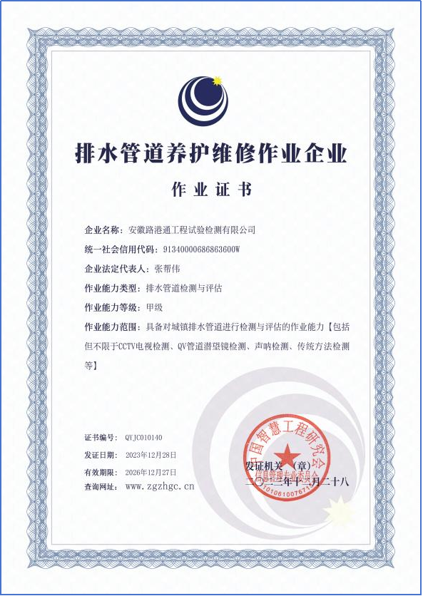 近日,安徽路港通工程試驗(yàn)檢測(cè)有限公司正式取得城鎮(zhèn)排水管道更新與非開挖修復(fù)和排水管道檢測(cè)與評(píng)估兩項(xiàng)作業(yè)能力甲級(jí)證書。