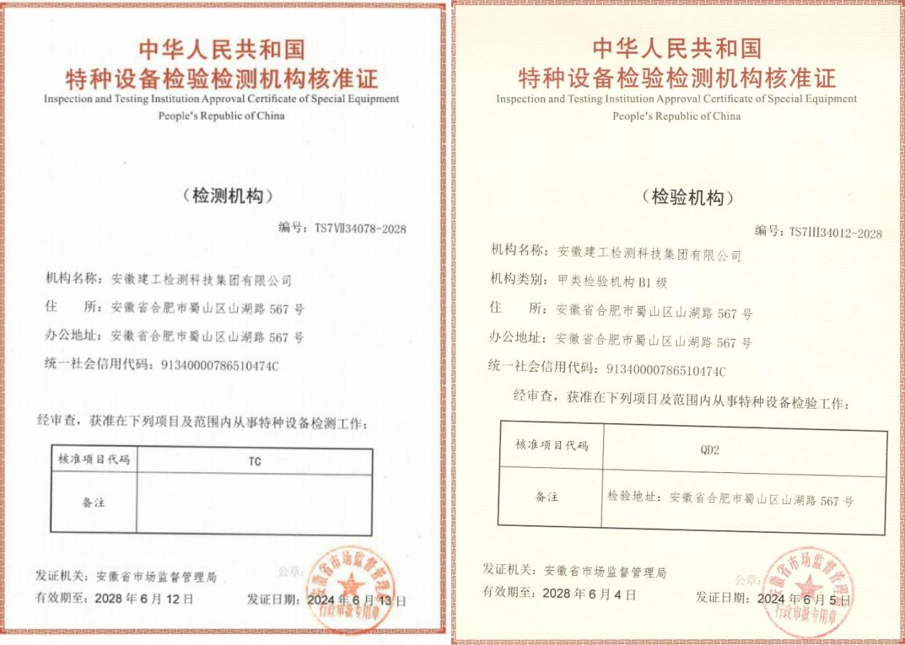 六月上旬,經安徽省市場監督管理局批復,建工檢測先后取得了特種設備檢驗機構核準資質(甲類檢驗機構B1級)及電梯檢測(TC)資質。該兩項資質的取得,標志著建工檢測現已具備全國范圍內開展特種設備檢驗檢測工作的資質。
