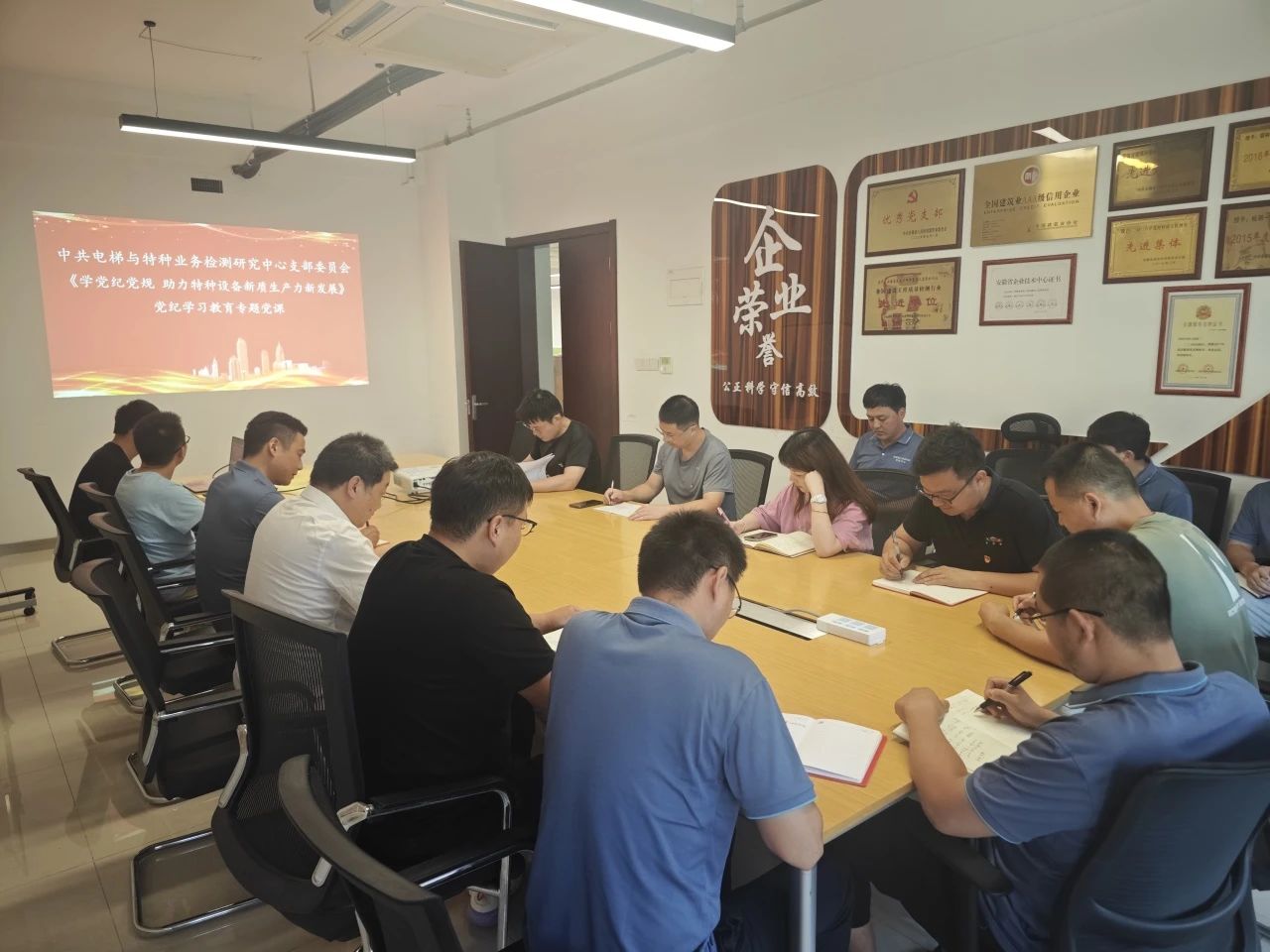 為認真學習貫徹《中國共產黨紀律處分條例》,推動黨紀學習教育深入一線,按照集團黨委統一部署,7月5日,特檢中心黨支部書記、中心主任楊昊同志結合中心工作講授《學黨紀黨規 助力特種設備新質生產力新發展》黨紀學習教育專題黨課,特檢中心班子成員、全體黨員、入黨積極分子、部分在崗電梯檢驗人員參加學習。
