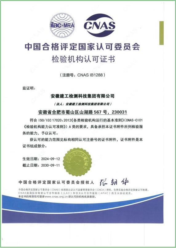 近日,安徽建工檢測科技集團有限公司順利通過中國合格評定國家認可委員會(CNAS)評定,獲得檢驗機構認可證書(注冊號:CNAS IB1288),為安徽住建領域首家獲證機構,同時成為具備CNAS雙證認可(CNAS實驗室認可和CNAS檢驗機構認可)的檢驗檢測機構。