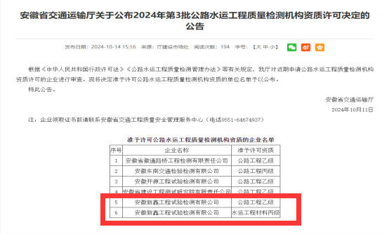 10月14日,安徽省交通運輸廳發布公告,安徽新鑫工程試驗檢測有限公司正式獲批公路工程乙級和水運工程材料丙級兩項等級資質。