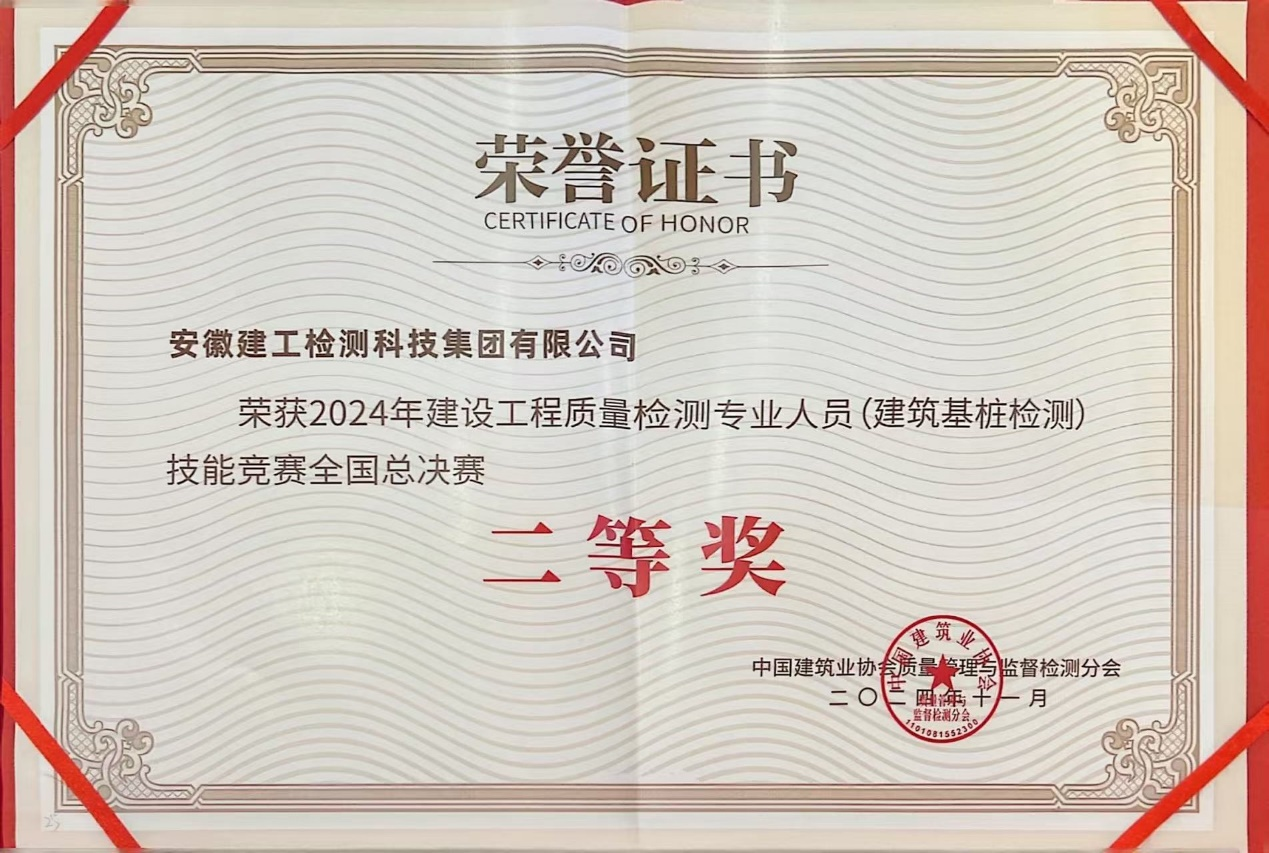 近日,在湖北武漢舉辦的2024年建設工程質量檢測專業人員(建筑基樁檢測)技能競賽全國總決賽上,建工檢測代表隊勇奪二等獎。