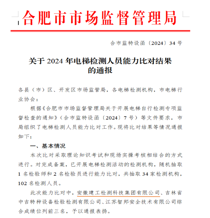 喜報(bào)!建工檢測(cè)榮獲合肥市2024年電梯檢測(cè)質(zhì)量比對(duì)競(jìng)賽冠軍!