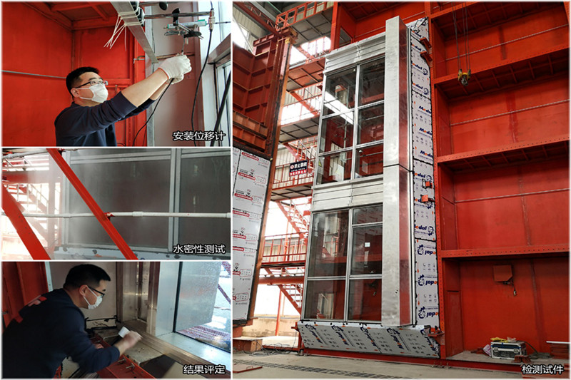 單元式玻璃幕墻由檢測委托方先行安裝,達到檢測條件后,選派技術熟練員工進行設備的安裝調試與檢測工作,主要包括氣密性、水密性、抗風壓與平面內變形四項性能所需的淋水裝置布置、支架安裝、位移計布點、線纜接駁、設備起停、軟件參數(shù)設置與運行等。測試完成后,幕墻所開展了深入地技術交流,并就結果計算、誤差分析、等級判定等數(shù)據(jù)處理相關工作進行了討論。