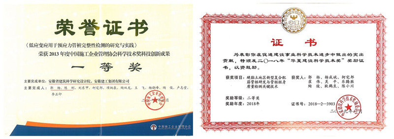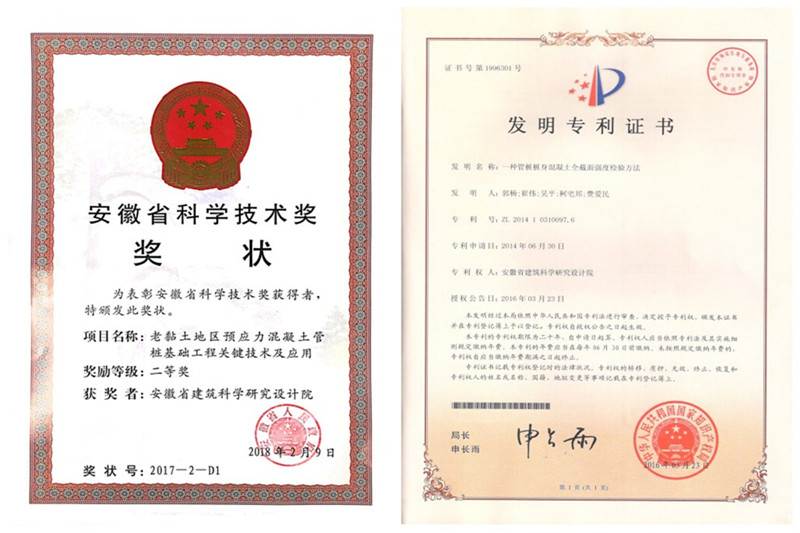 2012年-2019年,《一種管樁樁身混凝土全截面強度檢驗方法》等多項發明專利獲得授權,《預應力混凝土管樁技術標準》等十余部標準或規程發布實施,安徽省科學技術獎、華夏建設科學技術獎、中國建筑業協會科學技術獎、安徽省優秀勘察設計獎等各類榮譽和獎項不勝枚舉;