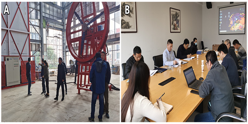 幕墻檢測設備驗收:(A)專家現場勘驗設備;(B)驗收報告會