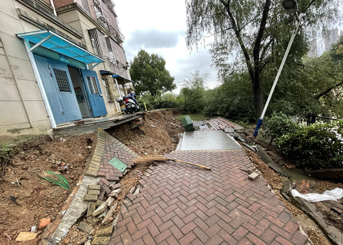 10月14日晚,因受連日持續(xù)降雨影響,六安市水云澗名居小區(qū)C組20號樓北沿次道與水上公園施工接壤處護坡發(fā)生塌方。為迅速掌握樓宇安全狀況及塌方原因,市、區(qū)、街領導及相關部門高度重視,于10月15日委托二站結構三所負責對六安市水云澗名居C組團20#樓北側護坡及路面坍塌進行檢測、監(jiān)測、鑒定。