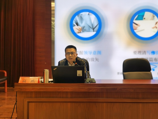 在賽前輔導環節,杜鵬主要從講話匯報材料、信息新聞材料及主要修改原則3個版塊,針對寫作目的、服務對象、傳遞載體、寫作要求等方面,對于常用文稿的理論層面做了全面的講授,更是深入淺出地通過一個又一個精彩實例,分享了多年工作中總結出來的寶貴經驗和寫作規律。